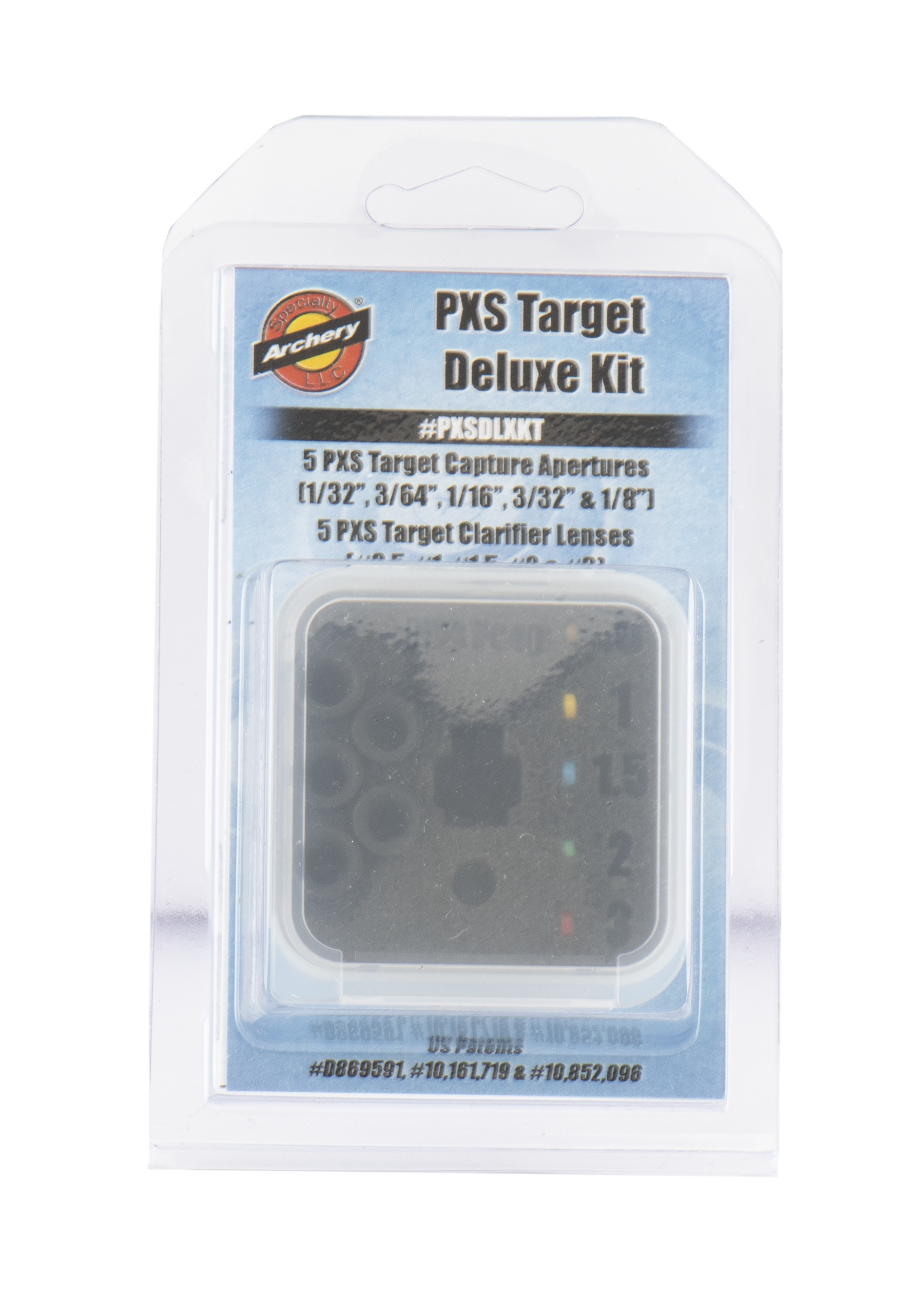 Das PXS Target Deluxe Peep Aperture/Clarifier Kit von Specialty Archery umfasst alle erhältlichen Apertures und Clarifiers des PXS-Peep-Systems. So können Schützen unterschiedliche Kombinationen aus Lochblende und Klarlinse ausprobieren, ohne einzelne Teile separat bestellen zu müssen.