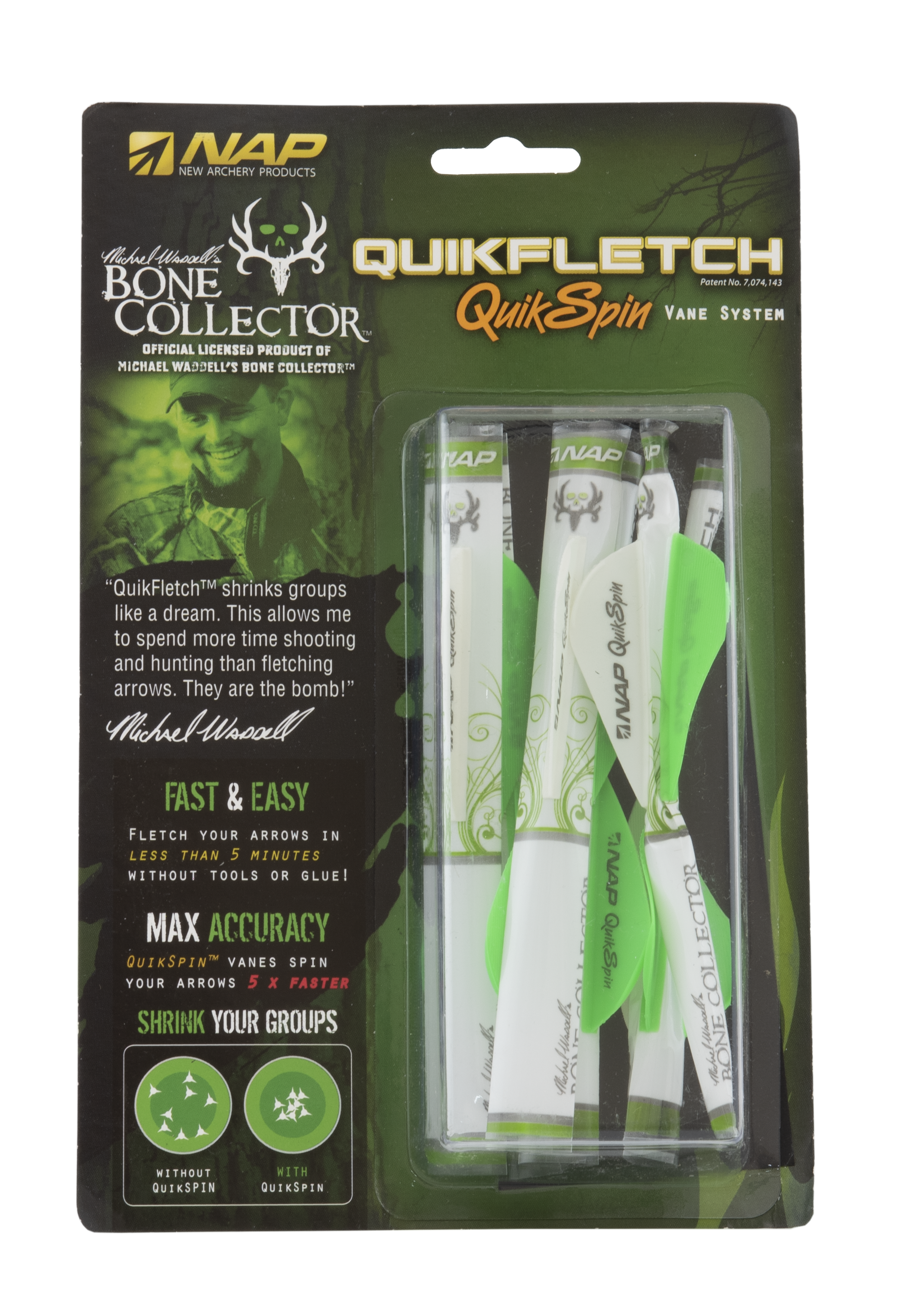 Die Quickspin-Geometrie sorgt für eine gleichmässige Drallstabilisierung des Pfeils, was zu einer verbesserten Flugbahn und Präzision führt. Die Bone Collector Edition ist in Grün erhältlich und bietet mit 2″ Länge eine kompakte Befiedерungsgrösse, die sich für verschiedene Pfeilschäfte eignet.